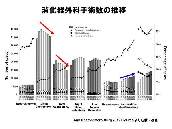 全国の消化器外科系の手術件数をNCDデータからみると(図2)、胃切除や胃全摘は全国的にも減少しており、他の手術も膵頭十二指腸切除が増加している以外は他の手術もほぼ同じか若干の減少にあります。手術件数の推移の地域偏があると考え、徳島県の状況を調べてみると、胃癌の手術(2007年ピーク474例→2018年298例、37%減)と肝癌の手術(肝癌2007年162例→2018年95例、41%減)の減少が特に大きく、結腸・直腸癌の手術(2011年ピーク783例→2018年735例)でも減少が見て取れます。特に大腸癌は全国的には図2の2つの術式を含む手術総数は依然増加している(2012年105,201例→2017年117,194例、11.4%増)にもかかわらず徳島県では既に減少に入っているわけです。